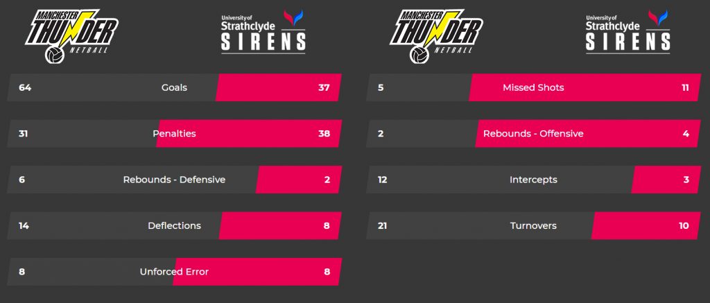 A deadly performance from Manchester Thunder in the last game of the season sealed a win against Strathclyde Sirens with a 64 – 37 win.